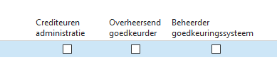 Crediteuren administratie: Dit veldbepaalt welke gebruiker aan de crediteuren administratie wordt gekoppeld. Indien een goed te keuren document wordt teruggestuurd naar de crediteuren administratie zal deze medewerker gekoppeld worden aan het goed te keuren document om corrigerende acties uit te voeren. Er mag maar 1 medewerker geselecteerd zijn